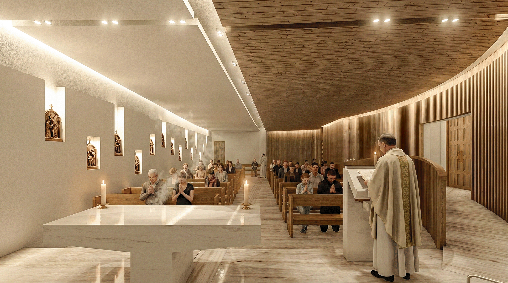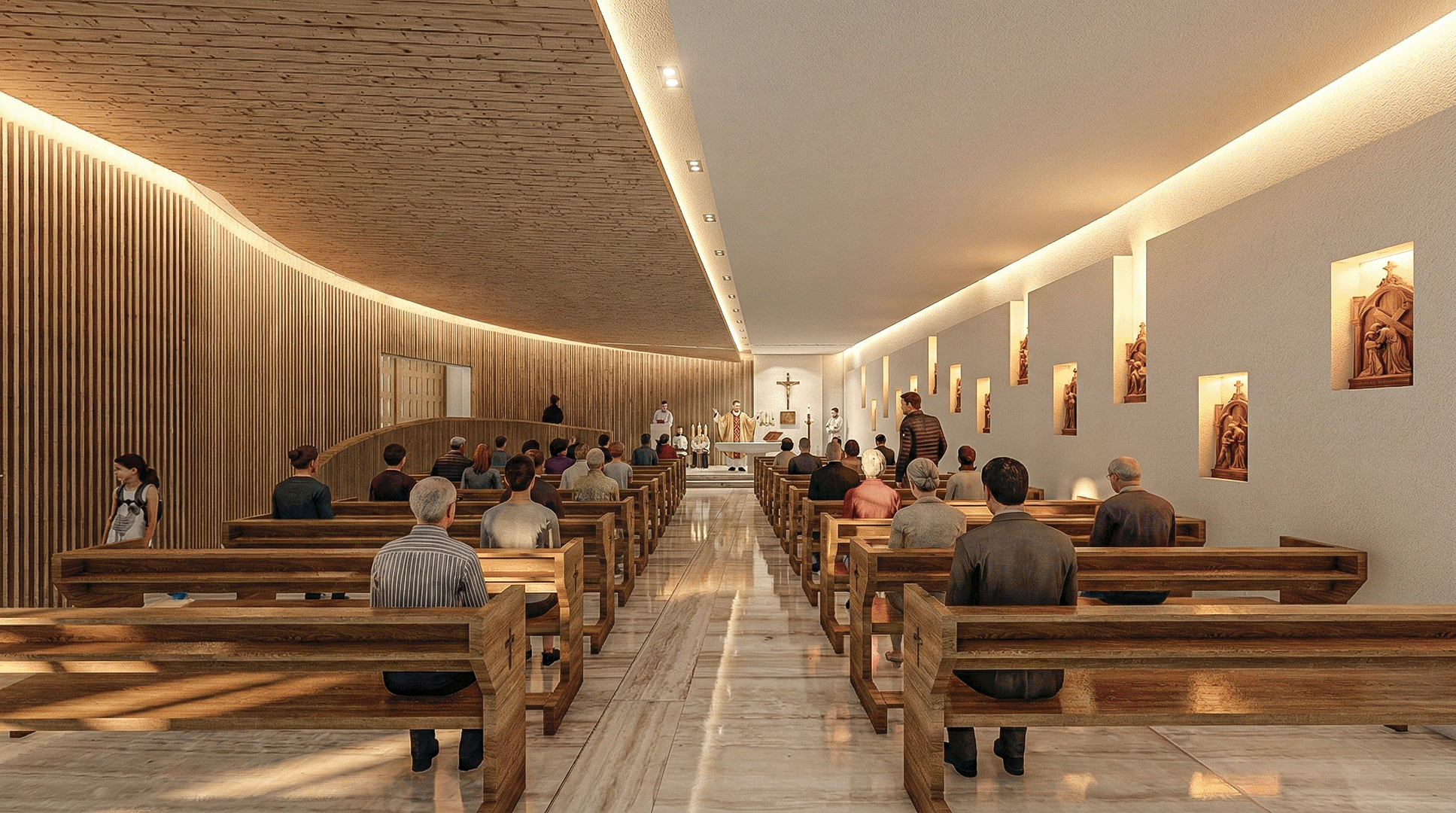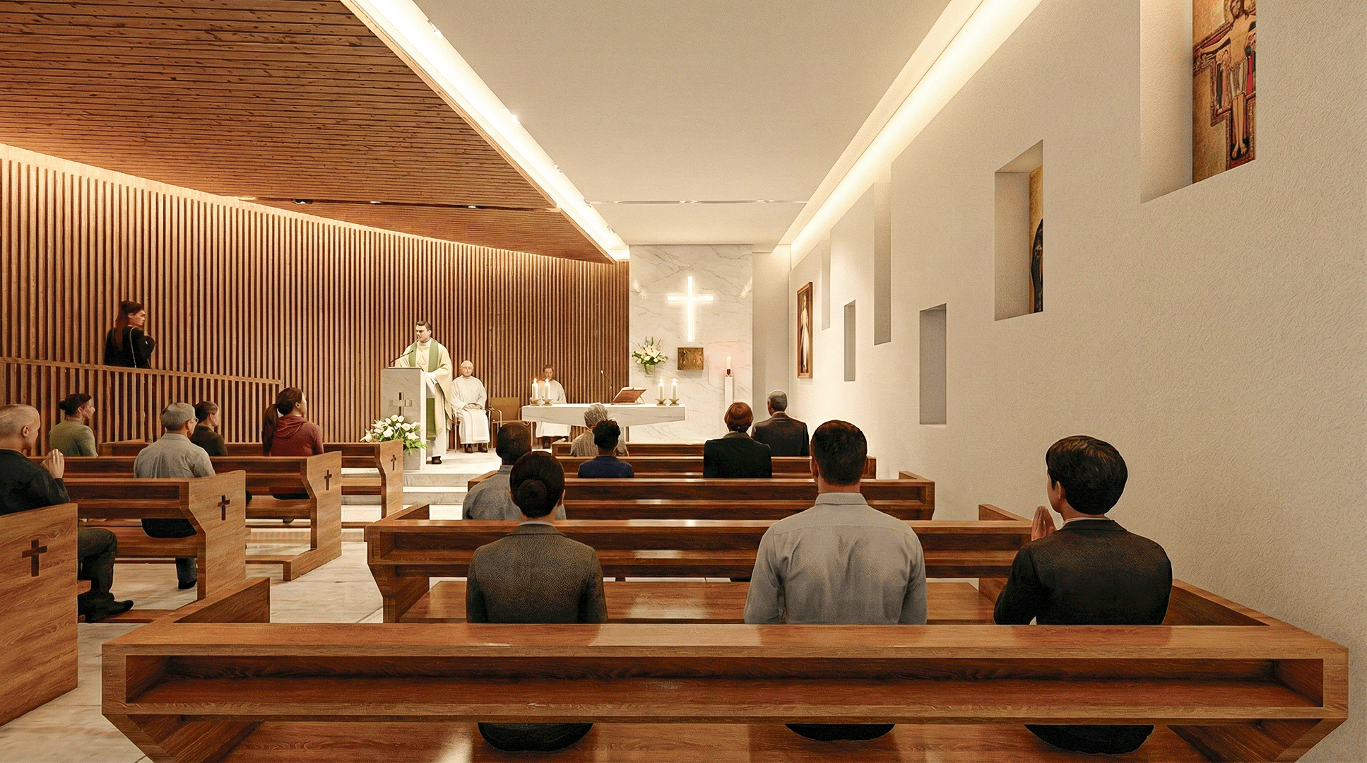 La propuesta se basa en un concepto de apertura y acogida, donde la fachada invita y expresa la vocación del proyecto. El diseño libera la planta mediante una forma envolvente y un rebaje del nivel de piso que permite una mayor altura interior, reforzando la direccionalidad del acto litúrgico a través del presbiterio. Una materialidad coherente y una iluminación indirecta vertical construyen una atmósfera de recogimiento, destacando los elementos litúrgicos principales en un espacio de 225 m² con capacidad para 112 personas.