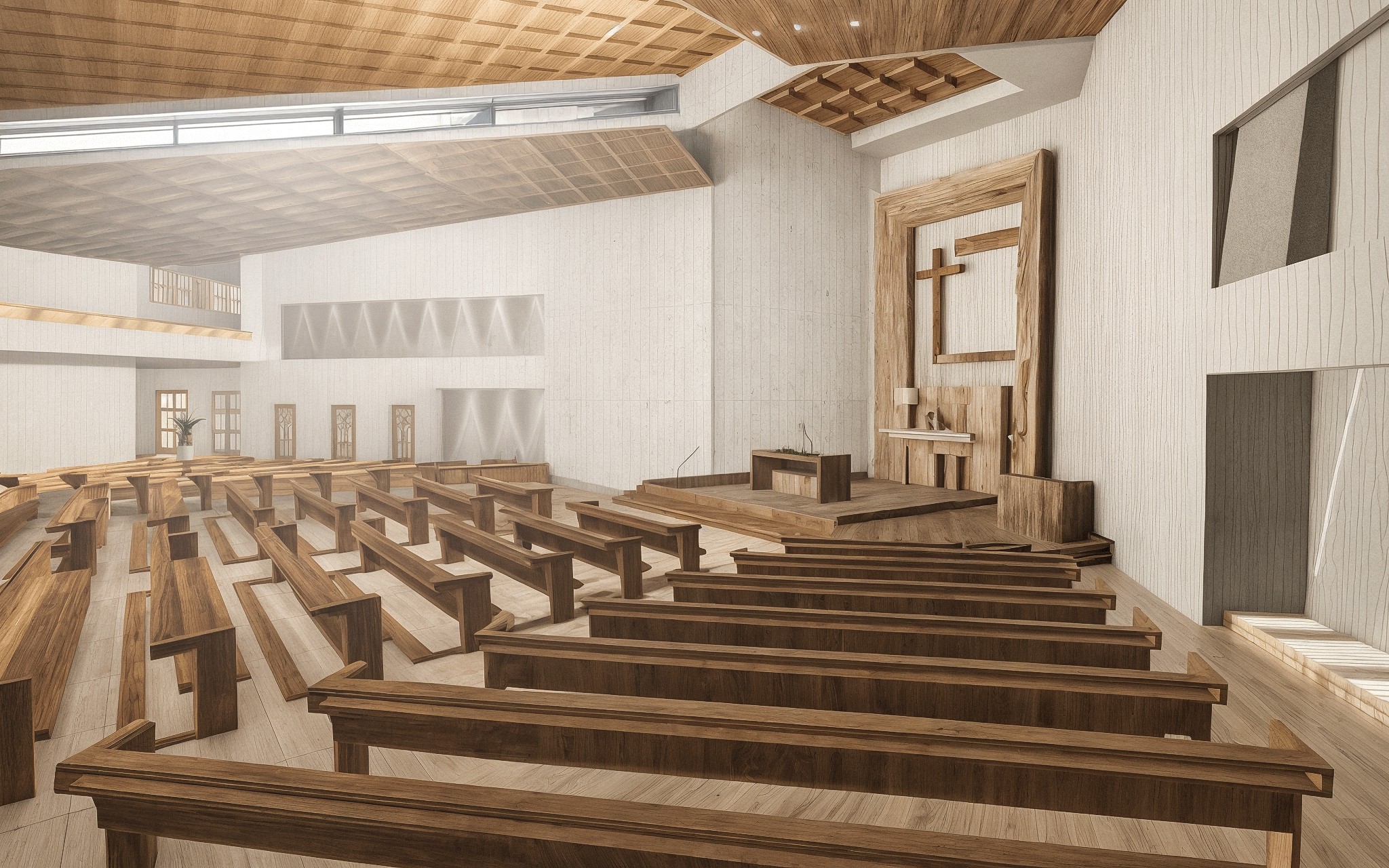 El interior presenta un espacio luminoso y cálido, gracias al uso de madera en los cielos y bancas, junto con muros claros que amplifican la luz natural proveniente de ventanas altas y lucarnas. El altar de piedra y el crucifijo central organizan el espacio, generando un ambiente espiritual, ordenado y contemplativo.