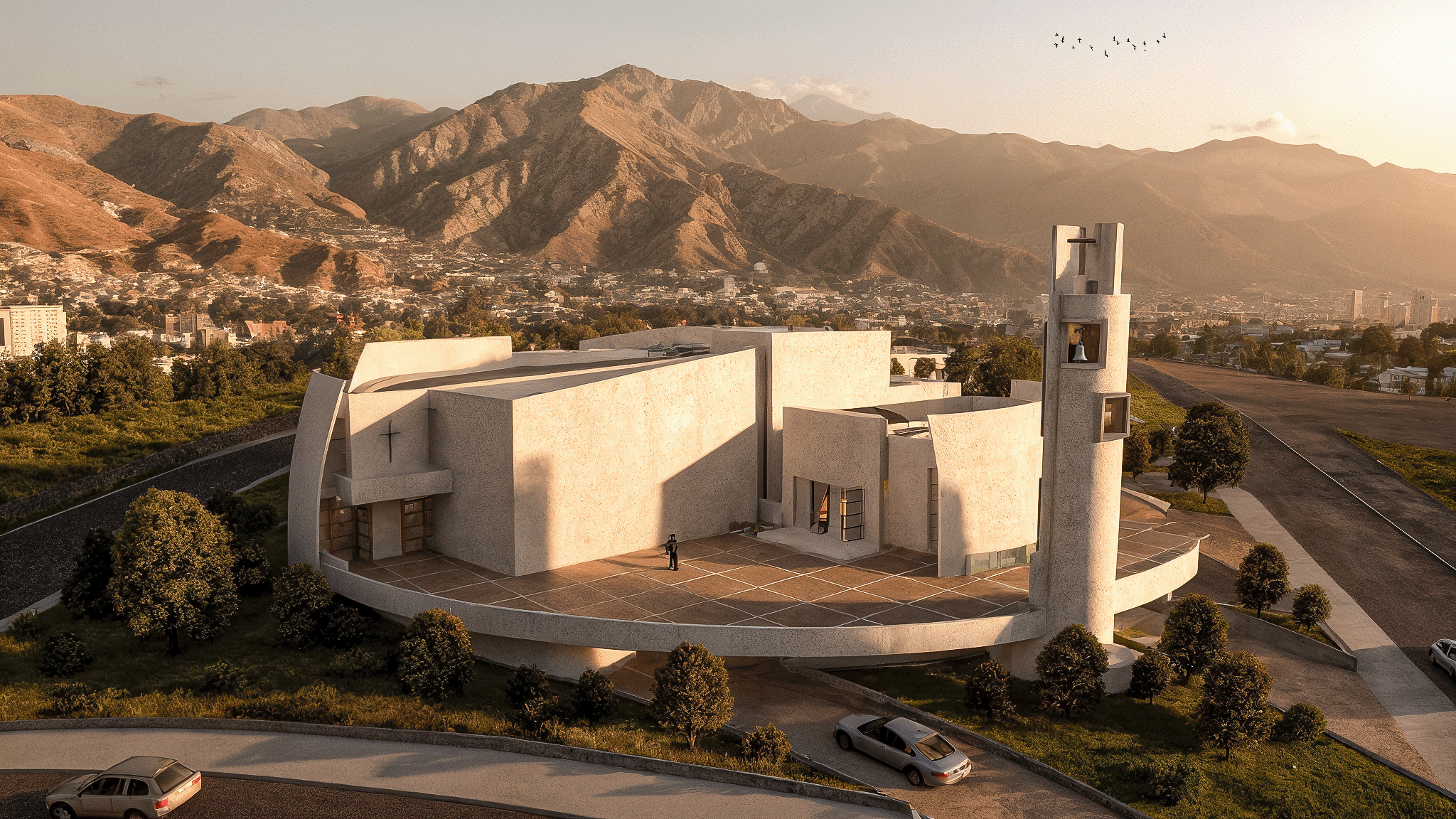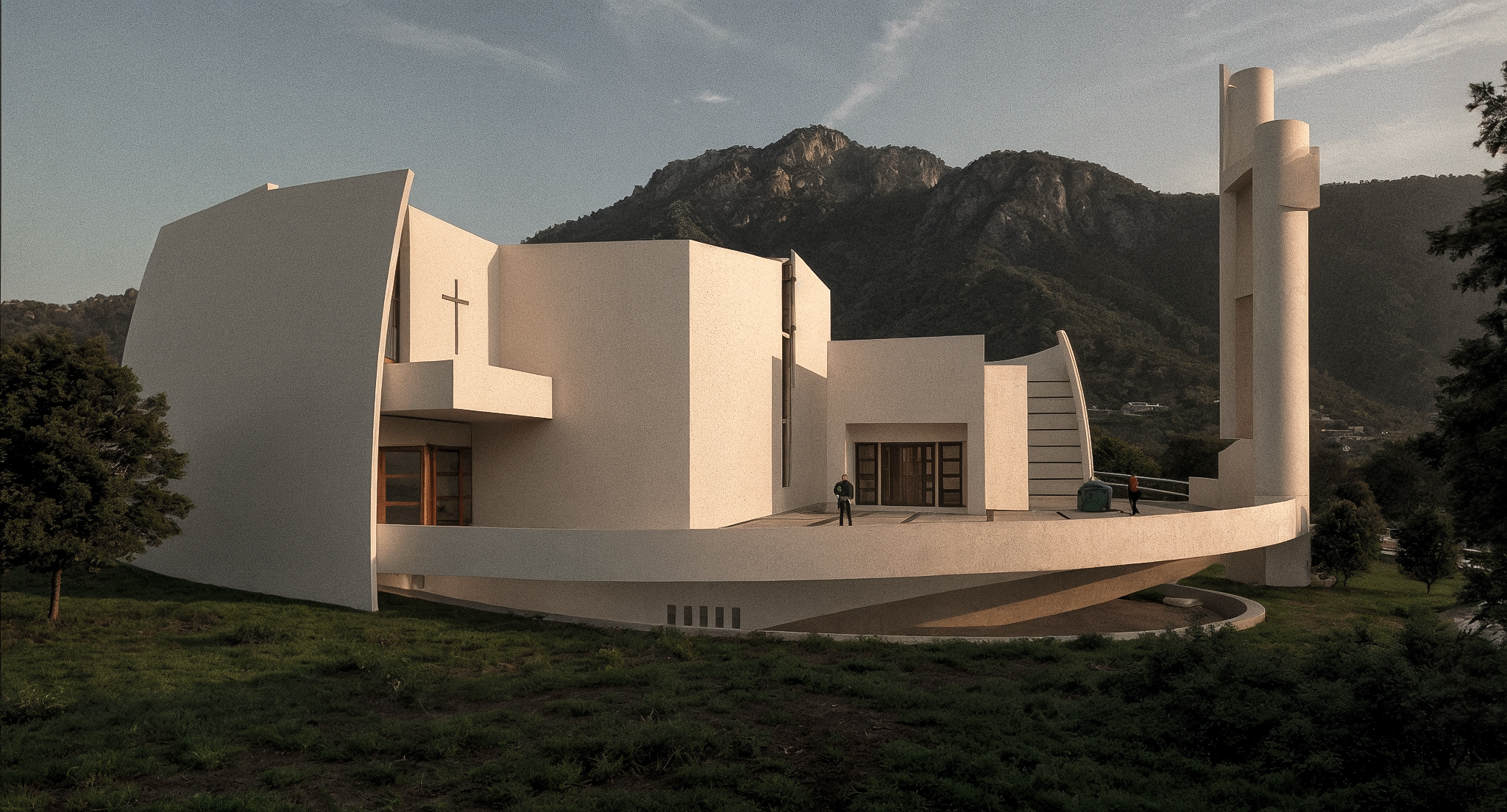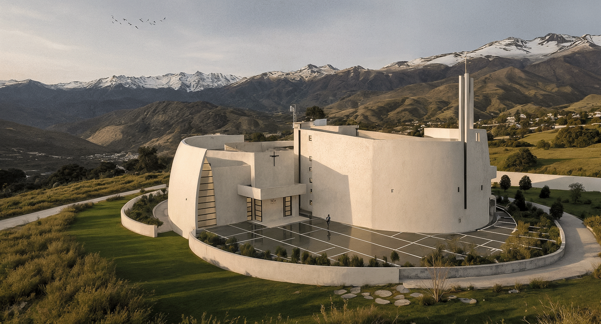 Propuesta Concurso. El proyecto consiste en una capilla contemporánea ubicada en San Carlos de Apoquindo, cuyo volumen blanco y minimalista destaca con claridad frente al paisaje de cerros que la rodea. Su arquitectura exterior es sobria y elegante, con una forma definida y serena.